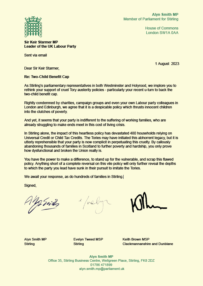 ‘As Stirling’s parliamentary representatives in both Westminster and Holyrood, we implore you to rethink your support of cruel Tory austerity policies – particularly your recent u-turn to back the two-child benefit cap.