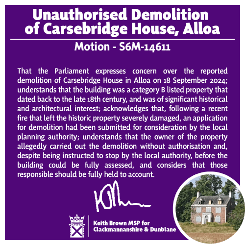 Keith Brown MSP, Member of the Scottish Parliament for the Clackmannanshire & Dunblane constituency, has lodged a motion in the Scottish Parliament expressing his concern at the unauthorised demolition of Carsebridge House in Alloa.